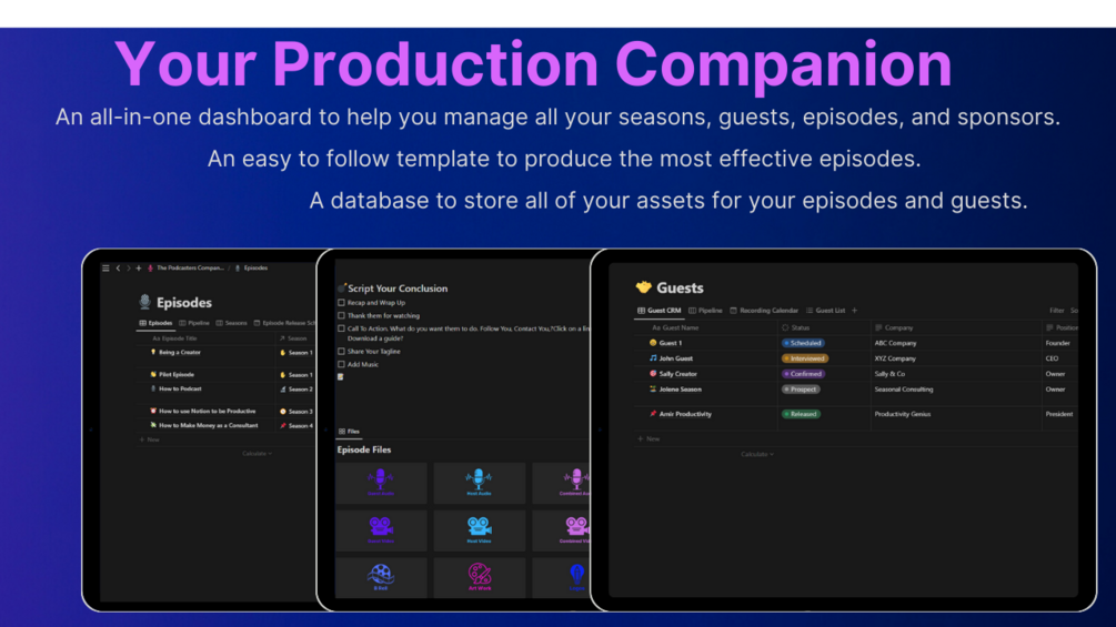 The Podcast Companion gives you access to the Production Companion that will help you build and manage your season, Guests, Episodes and Sponsors. The Complete version does all this plus it gives you access to the Marketing Companion and Learning Companion to give you all the tools you need to learn about podcasting and keep on top of your marketing, promotions and social media assets that you will DEFINITELY have to do to get traction with your podcast.