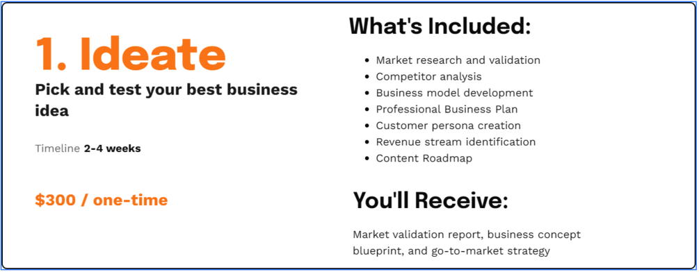 Market validation report, business concept blueprint and business plan with a go-to-market strategy.