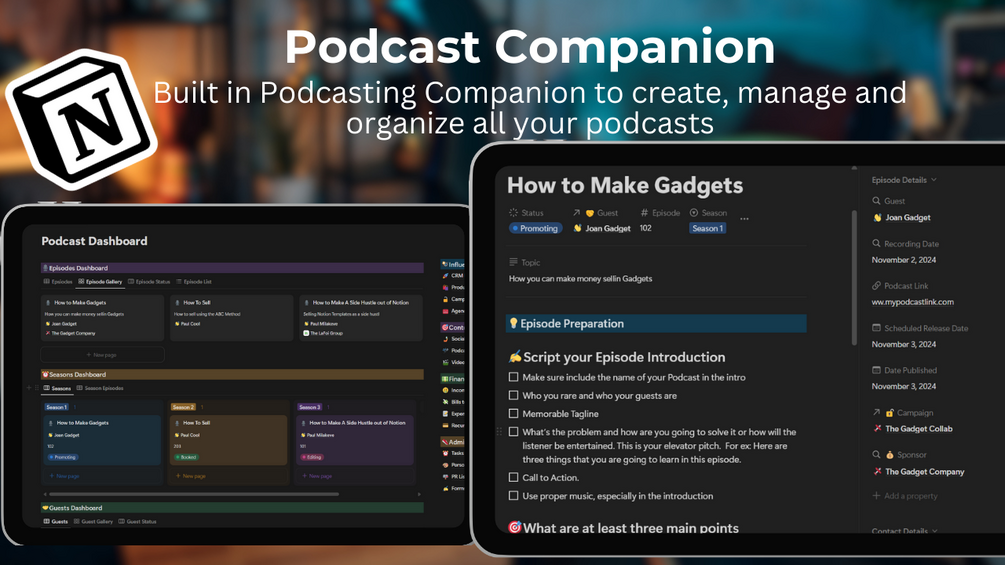 The Influencers Companion is a complete system designed in Notion specifically for social media influencers, podcasters, and content creators to help you organize, track, manage and maximize your brand partnerships.