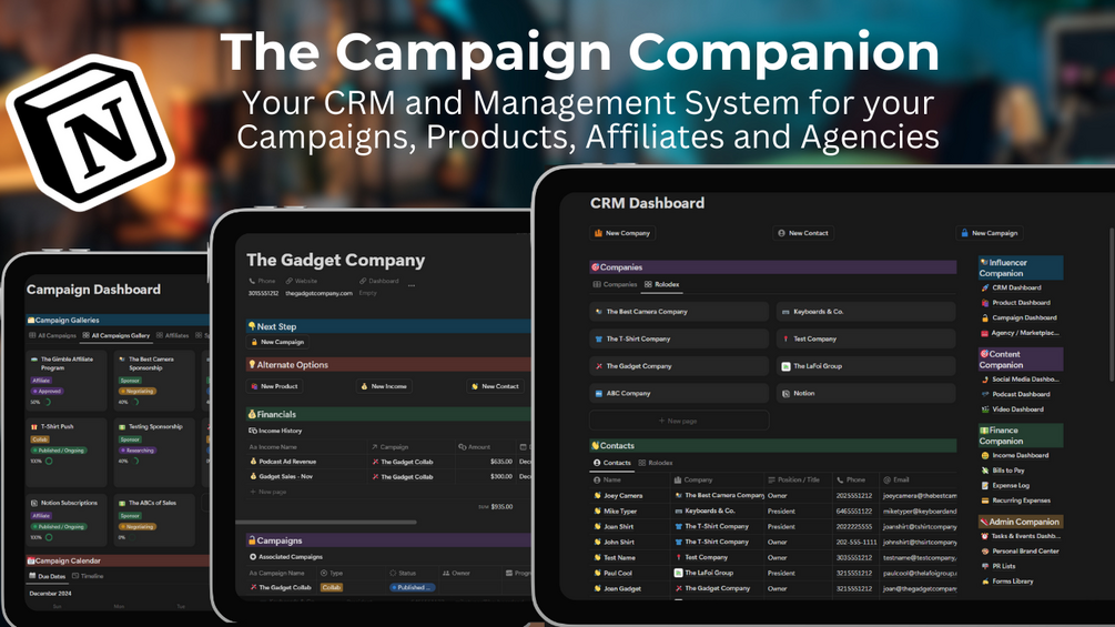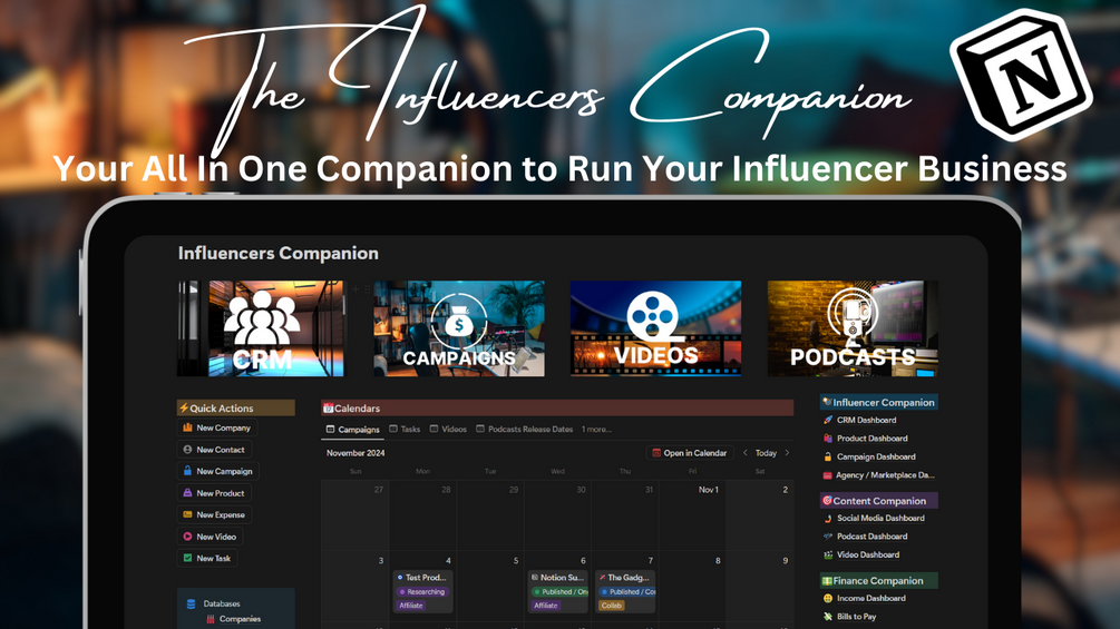 The Influencers Companion is a complete system designed in Notion specifically for social media influencers, podcasters, and content creators to help you organize, track, manage and maximize your brand partnerships.